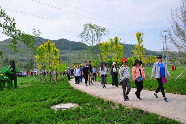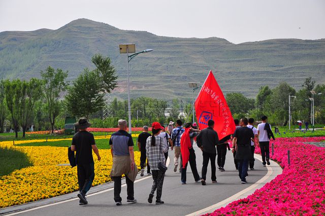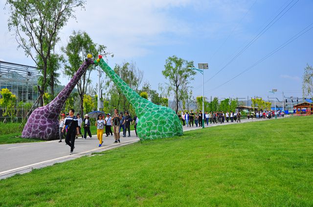 六月的高原,藍天白云,烈日當頭。適逢周末,游人如織,從出發地向景區中心地帶挺進,徒步在景園的觀景小道,處處姹紫嫣紅,映入眼簾的是一大片一大片絢麗的迎賓花海。花海主題區地勢呈中間高兩邊低的整體走勢。廣場、花海、雕塑、鄉趣園等不同主題的區域花海,阡陌交錯,異彩紛呈。大家在徒步旗手的引領下,在沁人心脾的花香牽引下,踏進極具田園色彩的大通匯豐景園。虞美人、丁香花、矮牽牛、孔雀草、萬壽菊等二十余種時令花卉,與其間各類花塑形成姿態各異的適季鮮花景觀,加上椒紅蔥綠的各色蔬菜園景觀,在風車的催動下,猶如一幅鋪向天際的流動畫卷。滿含泥土氣息的五谷豐登與彩陶藝術雕塑,讓我們仿佛置身于那個簡單、古樸的年代,久遠的文化、淳樸的民風與累累的碩果相得益彰,猶顯自在天然。徒步其中,聽自然和諧旋律,看輕風拂起麥尖,一處處田園風情蔓延開來,或耕、或碾、或織、或閑,時有鄉土味十足的卡通形象和稻草人穿插其間,瓜田李下、留客人家,鶯啼又燕舞,地沃而田肥,不禁喚起我們深藏在心中“守拙歸田園”、“把酒話桑麻”的美好回憶。