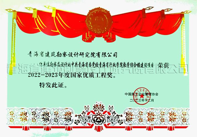 近日,中國建筑業(yè)協(xié)會、中國施工企業(yè)管理協(xié)會評選的2022-2023年度國家級優(yōu)質(zhì)工程獲獎名單揭曉,由我院巖土公司勘察的“中共青海省委黨校青海省行政學(xué)院教學(xué)綜合樓建設(shè)項目”獲“國家優(yōu)質(zhì)工程獎”。